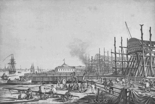 Адмиралтейские судостроительные верфи были заложены Петром Первым на левом берегу Невы осенью 1704 года. Считается, что строилось первое здание Адмиралтейства по чертежам самого Петра Великого. Проект включал верфи, доки, мастерские для строительства и ремонта кораблей, а также склады для хранения строительных материалов, корабельного вооружения и снаряжения.