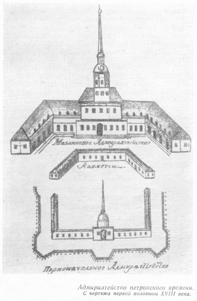 Первое здание Адмиралтейства, которое в то время называли «Адмиралтейским домом», представляло собой одноэтажный мазанковый корпус в форме буквы «П» с производственным двором, раскрытым к Неве. Спустя несколько лет в центре этого двора возвели каменный корпус Адмиралтейской коллегии, а над ним мазанковую башню со шпилем, увенчанным корабликом.