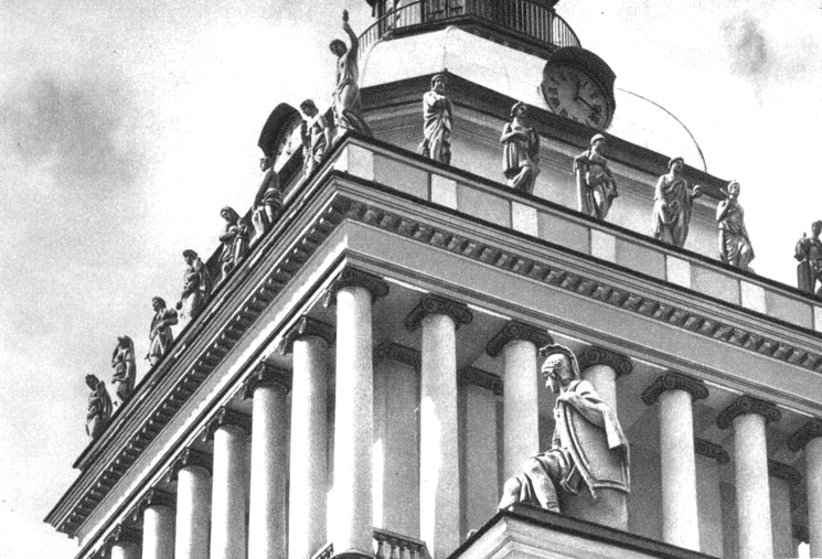 Четыре полководца и героя древности, помещенные по углам нижнего куба башни, — Ахилл, Аякс, Пирр и Александр Македонский — в глубокой задумчивости устремили свой взгляд на раскрывающийся перед ними город.