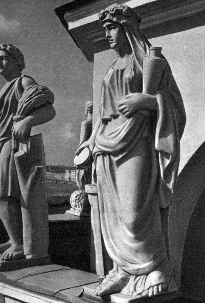 Два других барельефа — «Слава, венчающая науки» и «Слава, венчающая подвиги» — расположены на фронтонах портиков, обращенных в сторону площадей — Дворцовой и Декабристов. Все барельефы здания были выполнены Теребеневым.
