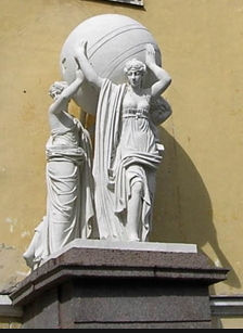 Легко и свободно несут они огромные сферы. Их спокойные, величавые фигуры в одеждах, ниспадающих мягкими складками, контрастно выделяются на гладком фоне стены.
