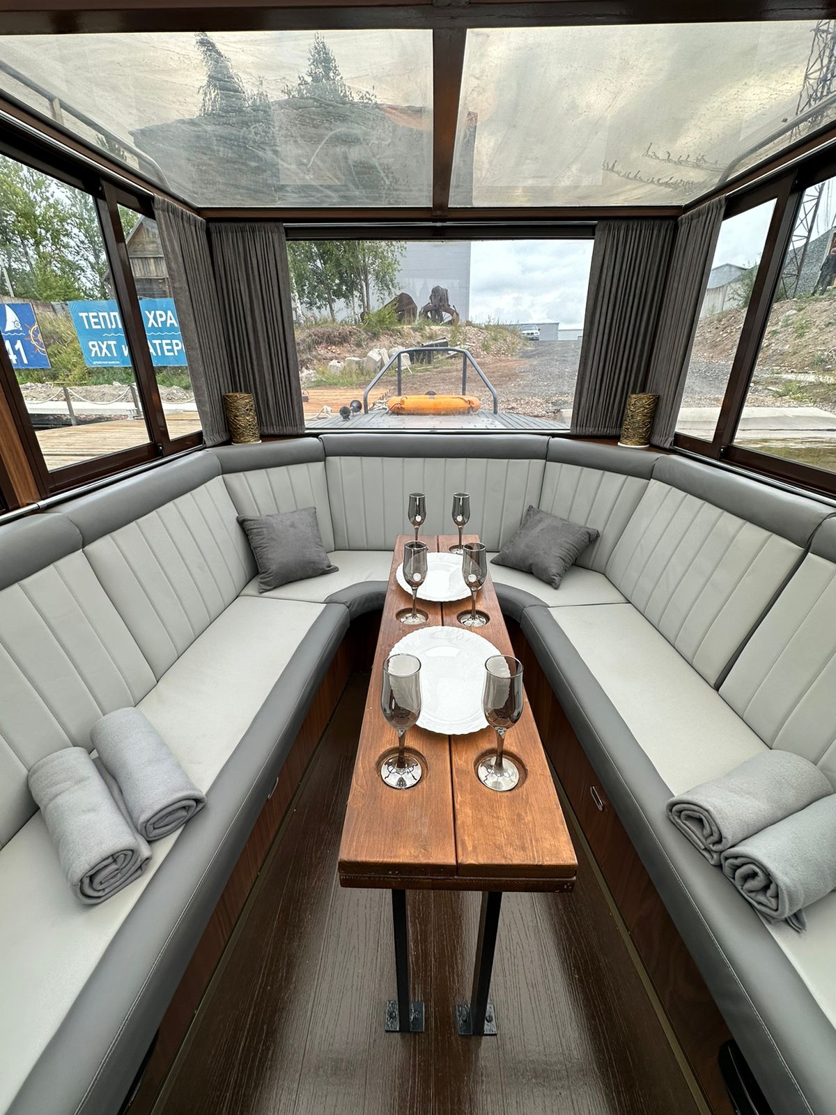 Поднимайтесь на борт нашего комфортабельного теплохода с каютой и панорамными окнами. На борту имеется все для полноценного отдыха — пледы, бокалы, посуда, музыка и туалет.