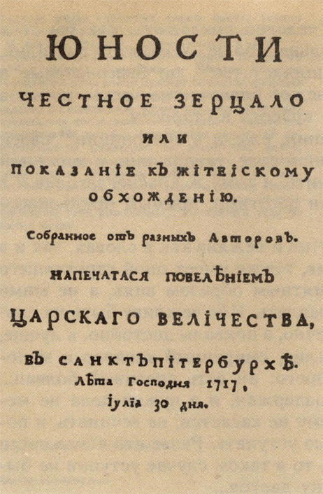 Петр Великий считал необходимым «прирожденную грубость благими науками и учением искоренять». В 1717 г. Я. В. Брюс начал составлять учебник «Юности честное зерцало, или Показание к житейскому обхождению».