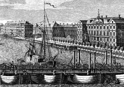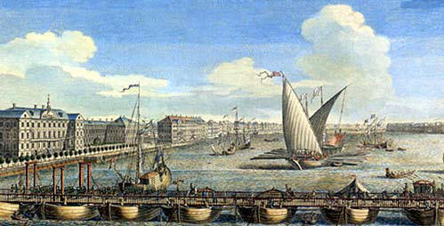 Однако в одном из литературных источников говорится о том, что в 1707 г. недолго существовал мост на плавучих опорах через Неву близ впадения в нее Охты . Вероятно, его сооружение было обусловлено военно-стратегическими соображениями. Это история наплавных мостов. Если верить гравюрам, то первые выглядели так: