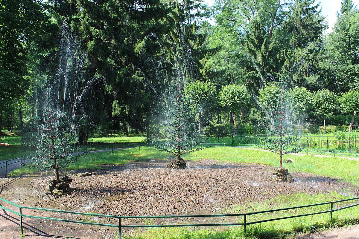 - Елочки. Выполнен в виде трех елей из металла. Сделан для шуток над гостями Екатерины II: когда те проходили мимо фонтана, включалась вода и мочила их одежду.
