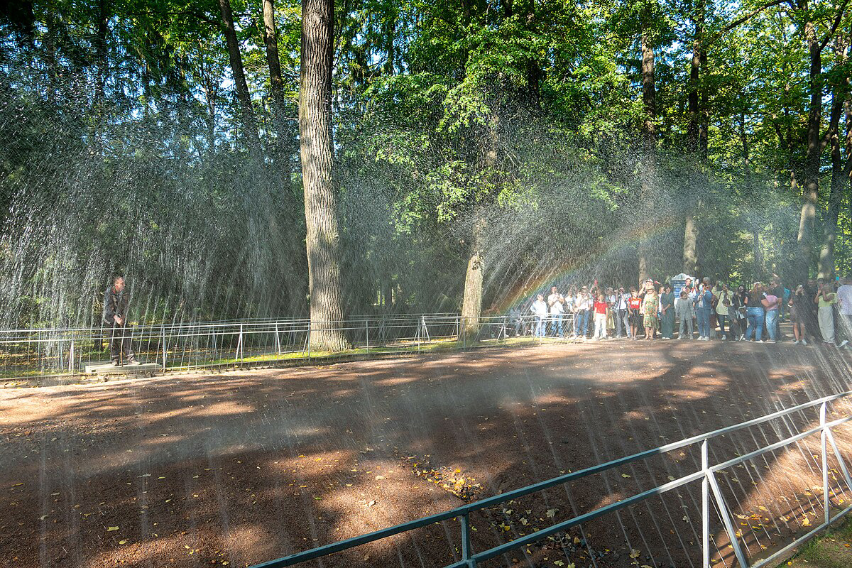 - Водяная дорога. Создан по замыслу Петра I. Выглядит как парковая дорожка, вымощенная кирпичом. Периодически справа и слева от нее появляются струи воды под наклоном и создают подобие водяного купола над головами тех, кто по ней идет.