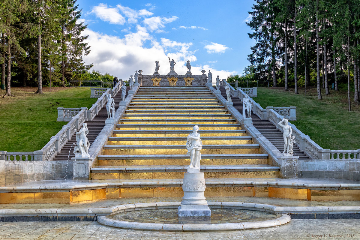 Этот каскад Петр I задумал после визита во дворец французских королей в Марли. Он представляет собой подобие лестницы из 22 позолоченных ступеней, по которым стекает вода, поступающая из 3 отверстий наверху. Венчают композицию 3 скульптуры античных героев.