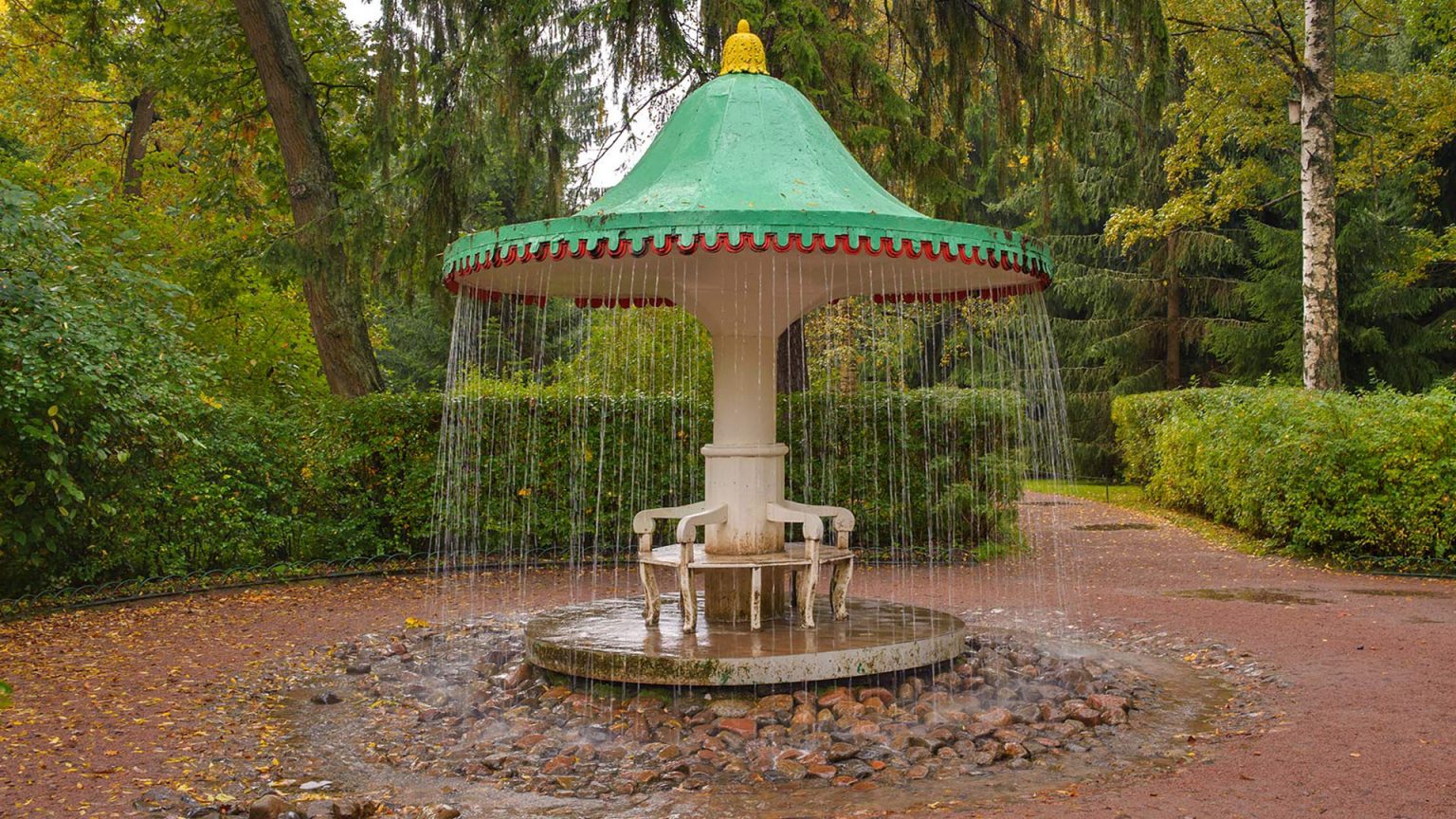 - Зонтик. Представляет собой беседку со скамейками в виде зонтика, с крыши которой периодически бьют струи воды. Чтобы не намокнуть и попасть в беседку, нужно быстро пробежать под ними. Создан для шуток над гостями Екатерины II.