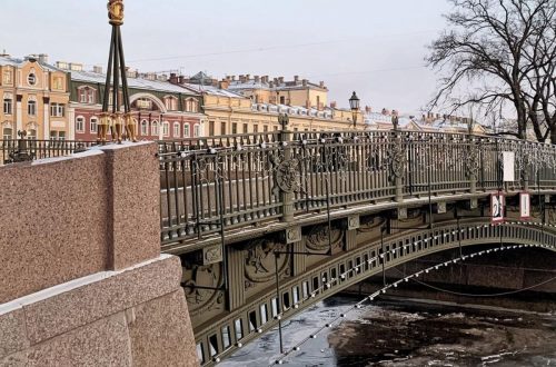 Перильными ограждениями на пролетном строении служат чугунные решетки художественного литья. Высокие канделябры в виде чугунных профилированных стоек увенчаны круглыми обоймами со светильниками по кругу. Они несколько помпезны. Им противопоставляются скромные чугунные ограждения из часто расставленных прямых оригинально соединенных