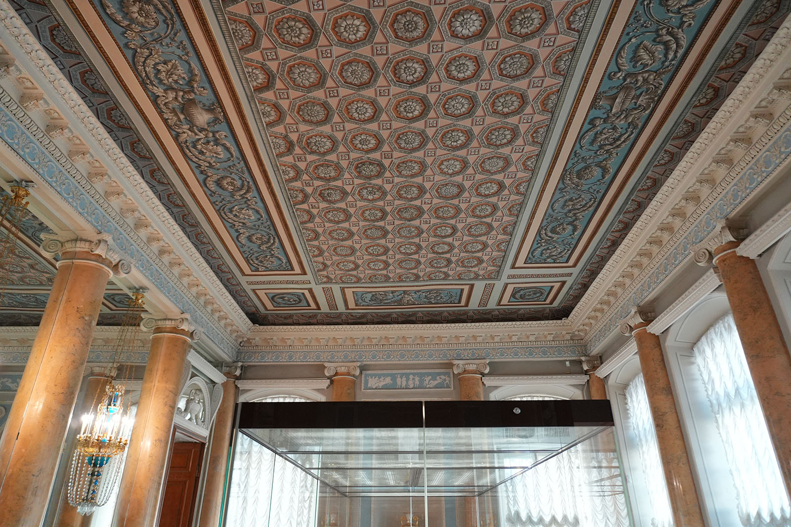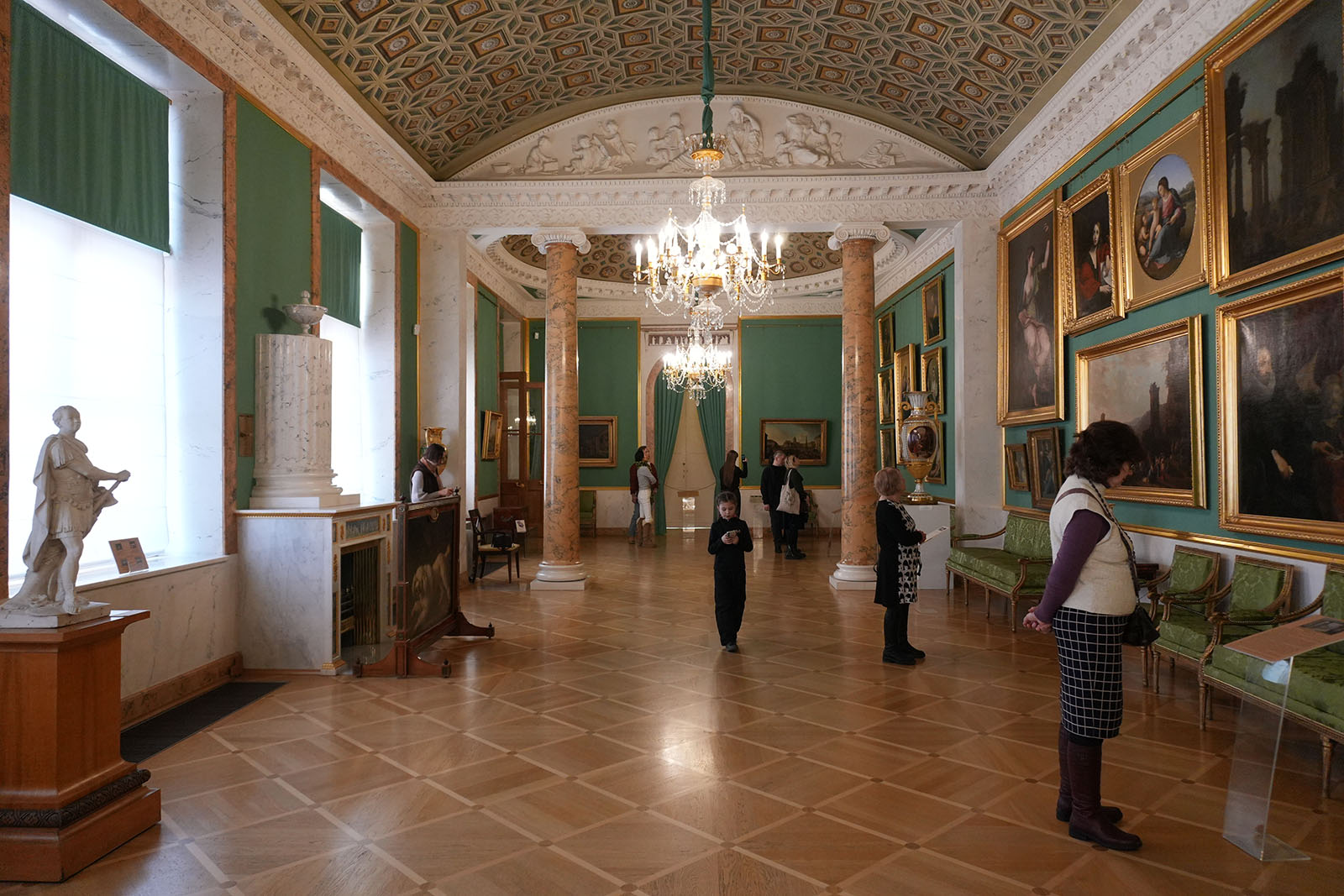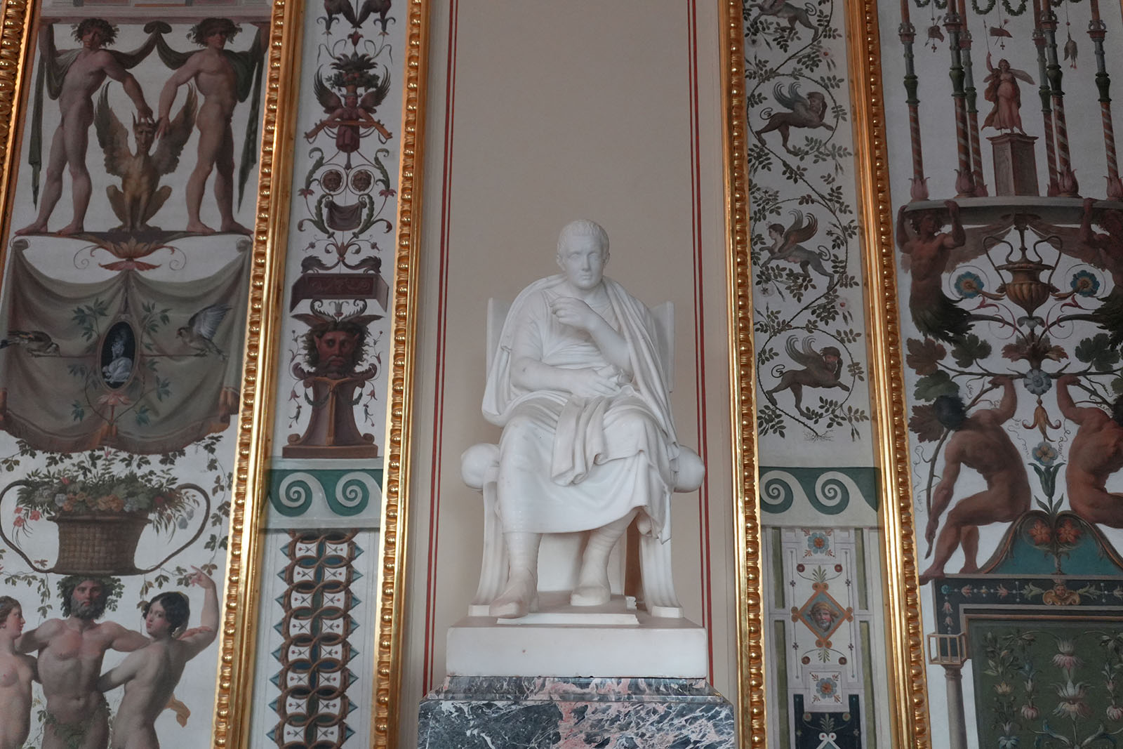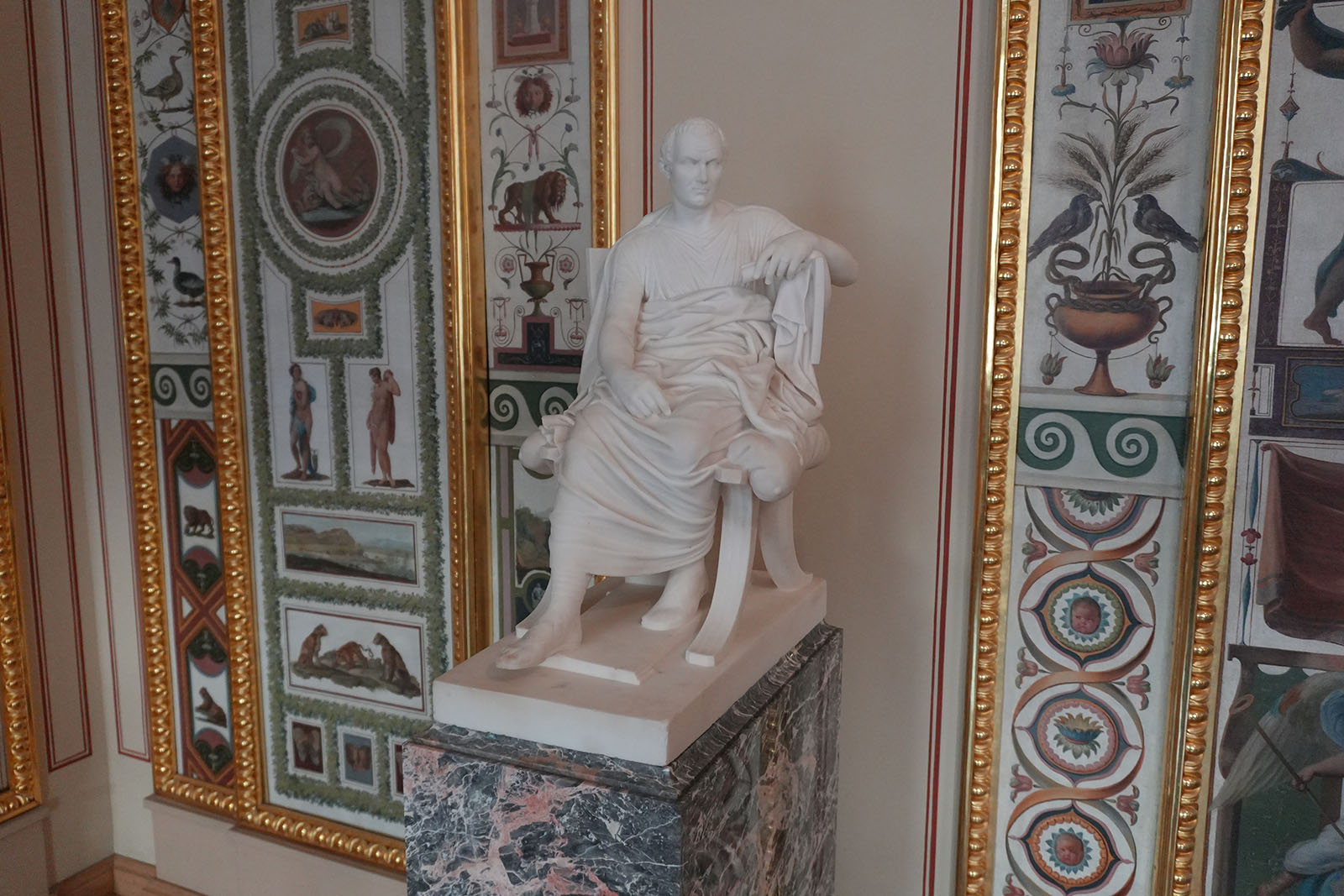 Зал украшен копиями фресок Рафаэля. В то время роспись по мотивам Ватиканского дворца была очень популярна. Итальянские живописцы изобразили рафаэлевские лоджии. Дополняют фрески декоративные композиции сюжеты виллы Цицерона – помпеянская живопись. В гостиной есть две скульптуры: сидящие философы в античных одеждах.