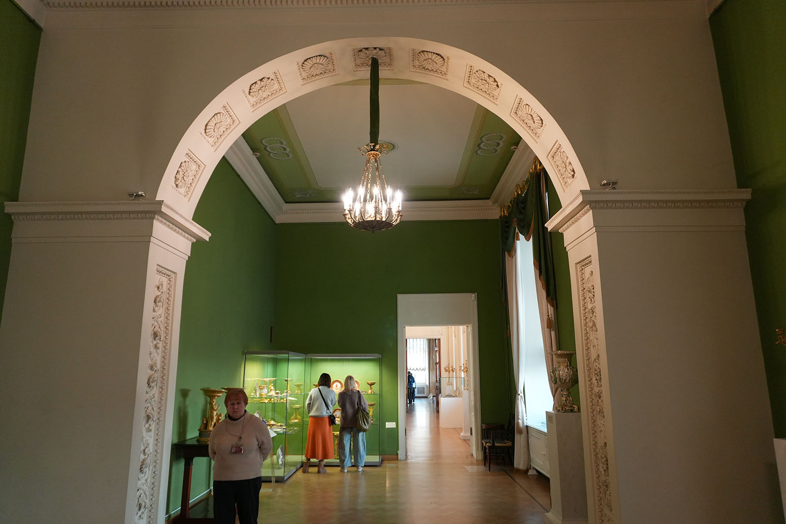 Огромная зеркальная стена придает объем и простор помещению. Столовая украшена колоннами и красивыми удлиненными люстрами. По воскресеньям здесь устраивали обеды для любителей искусства. Они приходили в столовую, посетив Казанский собор.