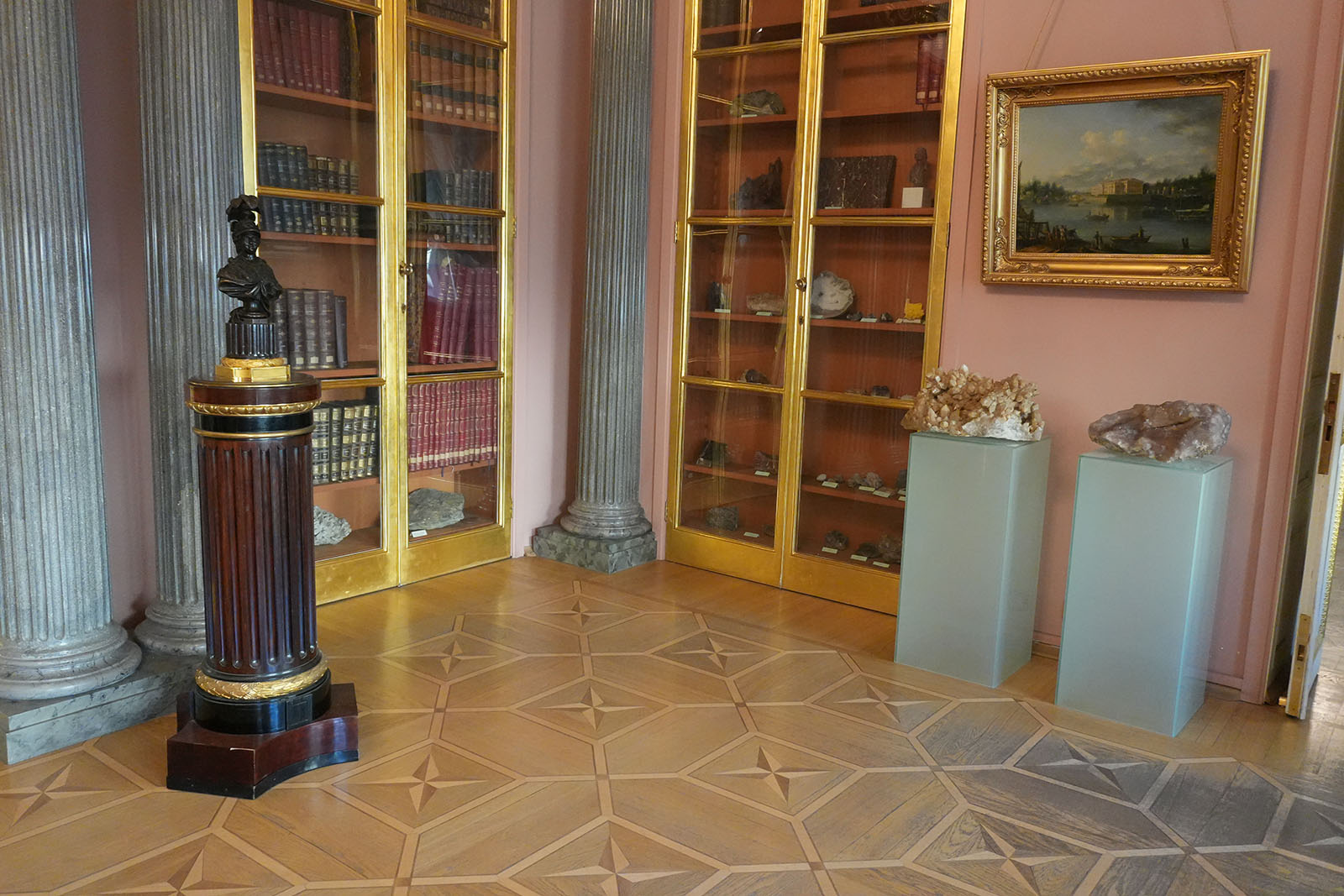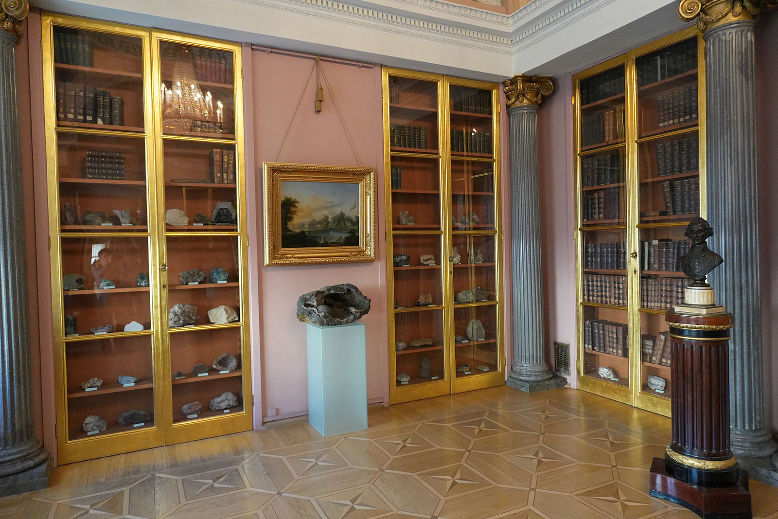 Александр Строганов часто бывал в королевских домах за рубежом и загорелся желанием создать такую палату. Вскоре А.Воронихин оформил в изысканном стиле научный кабинет. В нем размещали книжное собрание графа и знаменитую коллекцию минералов. Сейчас здесь представлены картины и походный сундучок для горных пород. Книжный шкаф маскирует потайную дверь.