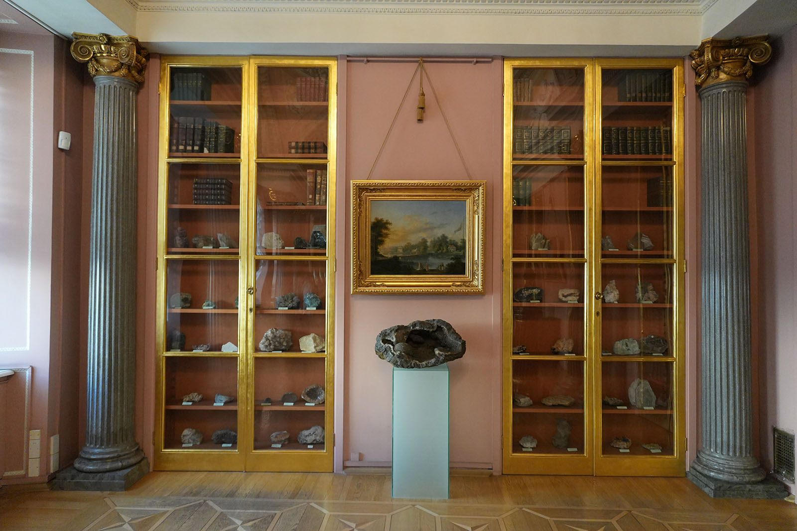 | Постоянная экспозиция | Минералогический кабинет | Двухсветный зал считается шедевром русской культуры конца XVIII века. В творении А.Воронихина воссоздан изысканный интерьер: аллегорические барельефы, колонны, колоритная роспись купола. Гости познакомятся с обширной коллекцией минералов. |