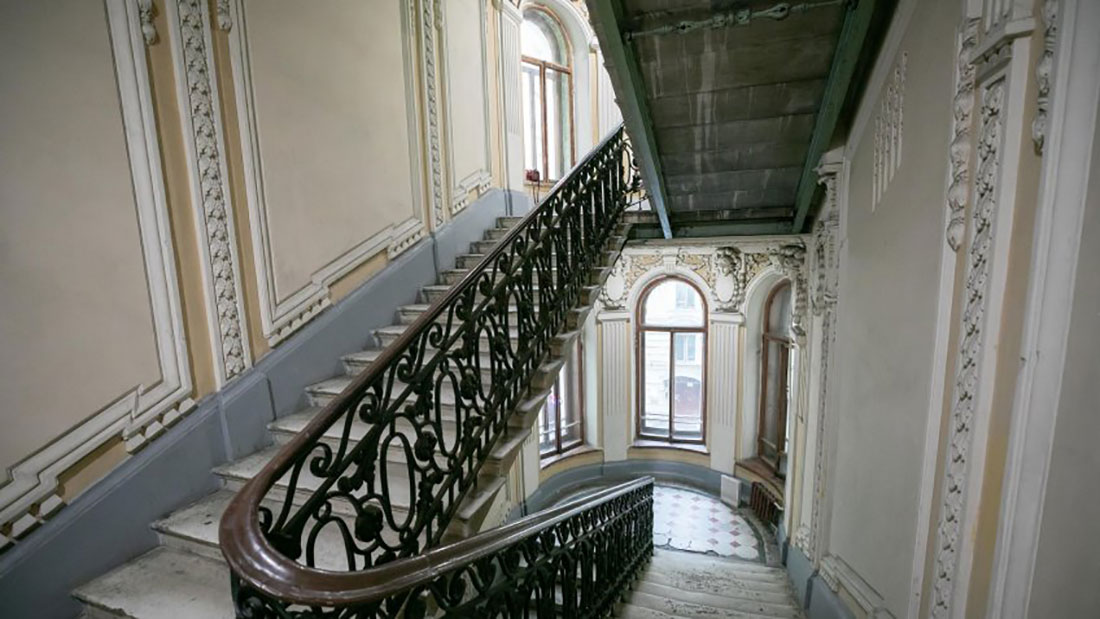 Здание расположено на углу Литейного и Фурштадской, поэтому имеет две парадные. Со стороны проспекта к 2019 году сделан ремонт. «Советский» зеленый цвет стен заменен на нежно-голубой, лепнина выделена белым. Вы увидите старинный камин, оригинальные решетку лифта и лестничного ограждения, плиточную мозаику на полу, арочные окна. Пройти можно, так как здесь расположены две гостиницы «Экспо» и «Литейный».